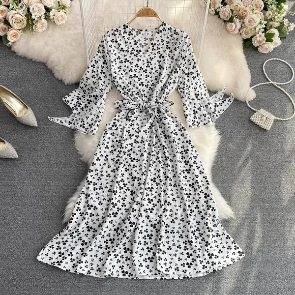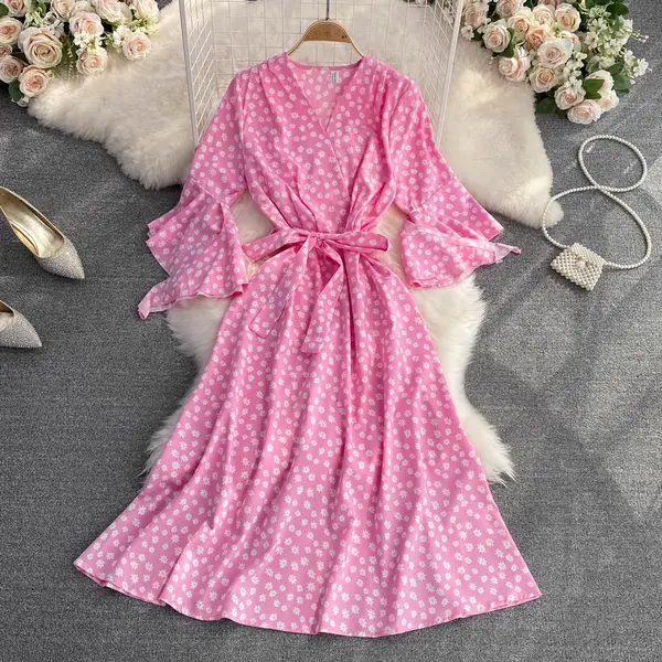 2025 summer new fashion trumpet sleeves V-neck waist slimming temperament A-line dress elegant long skirt